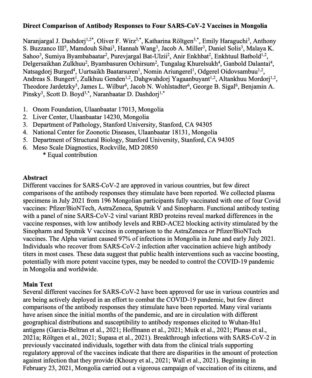 Scientists published Comparison of Antibody Response to Covid Vaccines in Mongolia